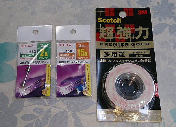 急ぎHCへ向かい、同型のヒューズ(エーモン 1593 低背ヒューズ 12V-24V車用 15A 2個入り)178円を購入。 駐車場で問題のヒューズを取替え、ラジオ・格納ドアミラーの動作を確認した。v(^o^)v